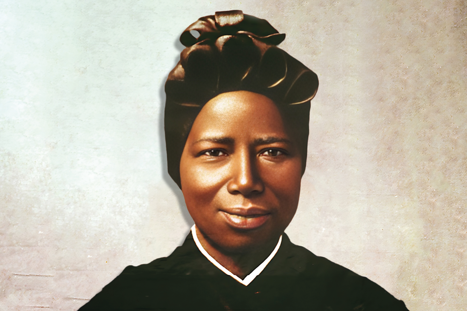 Née au Soudan, Joséphine Bakhita (vers 1869-1947) a été une esclave, avant de devenir religieuse canossienne, puis sainte. Kidnappée vers l’âge de 7 ans, elle est vendue plusieurs fois comme esclave à des maîtres qui la maltraitent et la martyrisent. Ce sont ses ravisseurs qui lui ont donné le nom de Bakhita, qui signifie « la chanceuse ». Vers l’âge de 13 ans, elle est achetée par Calisto Legnani, consul italien à Khartoum, un homme bon qui, trois ans plus tard, suite à un soulèvement, l’amène en Italie, dans la région de Venise, où il la confie à la famille Michieli ; là, elle devient la nounou de leur petite fille qui vient de naître. Leur intendant, Illuminato Cecchini, offre un jour un crucifix à Joséphine et lui fait découvrir Jésus, son « Bon Patron », qu’elle recherchait et qui la protégeait avant même qu’elle ne le connaisse.